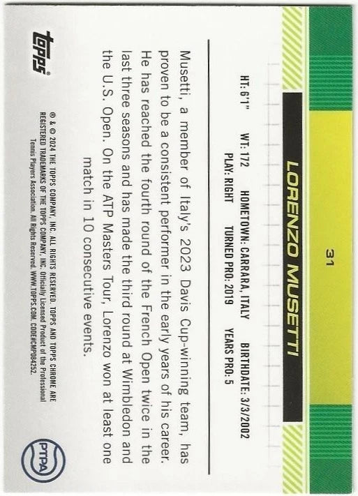 Lorenzo Musetti Autographed/Signed 2024 Topps Chrome Sapphire 1st Card!